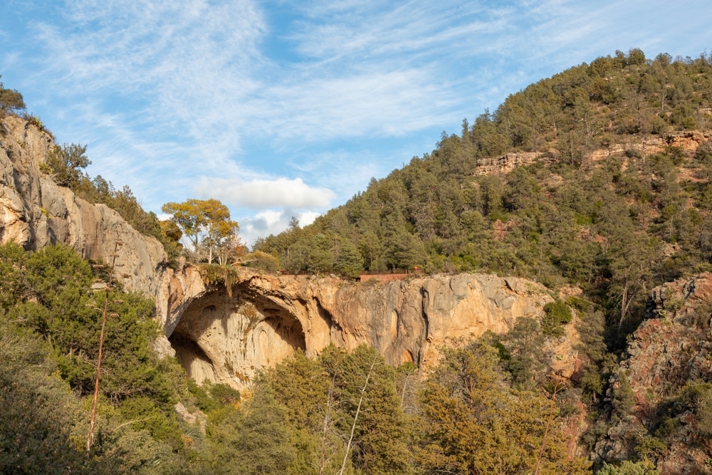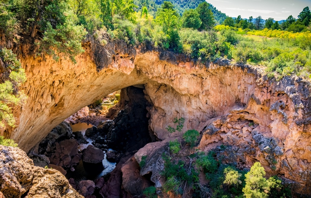 Nestled in a hidden valley among the towering pines of Arizona’s Rim Country, Tonto Natural Bridge State Park protects what is believed to be the largest natural travertine bridge in the world. This geological wonder stands 183 feet high over a 400-foot long tunnel that measures 150 feet wide. The magnificent limestone bridge is the stunning centerpiece of this 150-acre park that provides visitors an opportunity to witness one of Arizona’s most spectacular natural wonders.